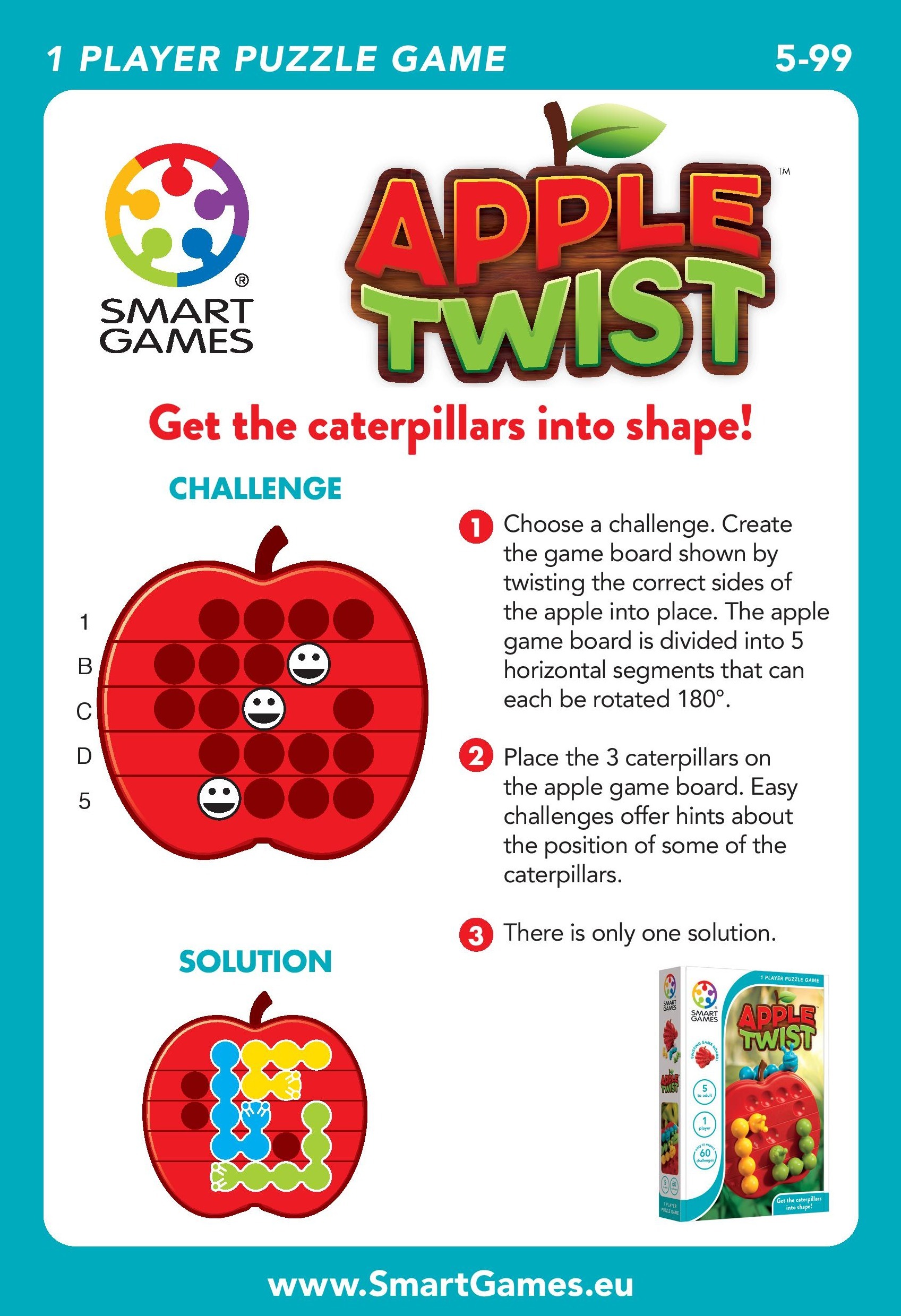 · 根據挑戰咭上的提示,將3條毛毛蟲放在蘋果遊戲板上。每條毛毛蟲都可以扭曲成不同的形狀。毛毛蟲的所有部分必須擺放在蘋果遊戲板的窩點內。初階的挑戰會提示某些毛毛蟲的位置。