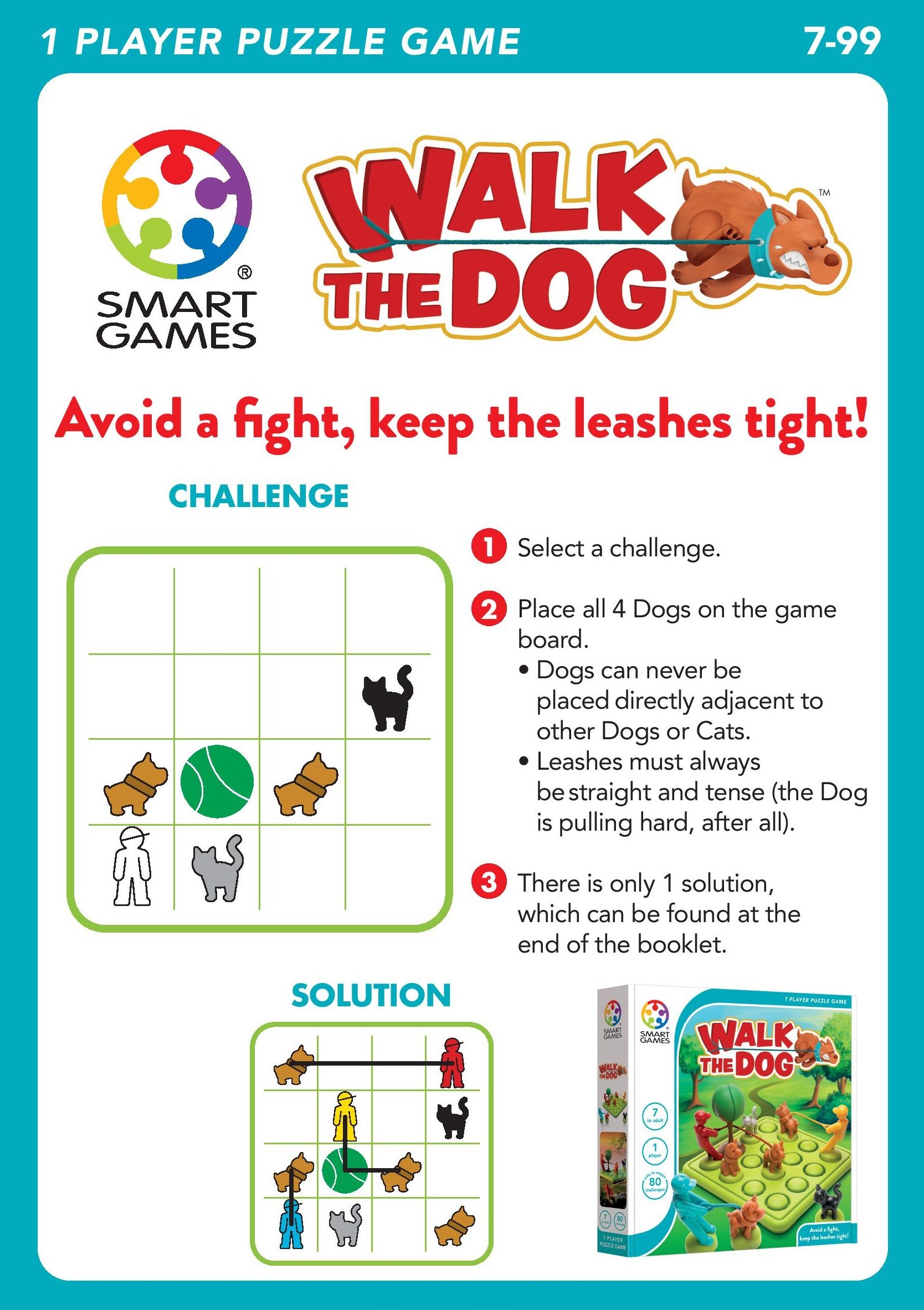 · 再將4隻小狗依照挑戰咭上的規則擺放到遊戲板上。其中三隻小狗必定是跟主人連在一起的,而每隻小狗一定不能擺放在另一隻小狗或小貓的前後左右。牽着小狗的繩必須要直及拉緊!