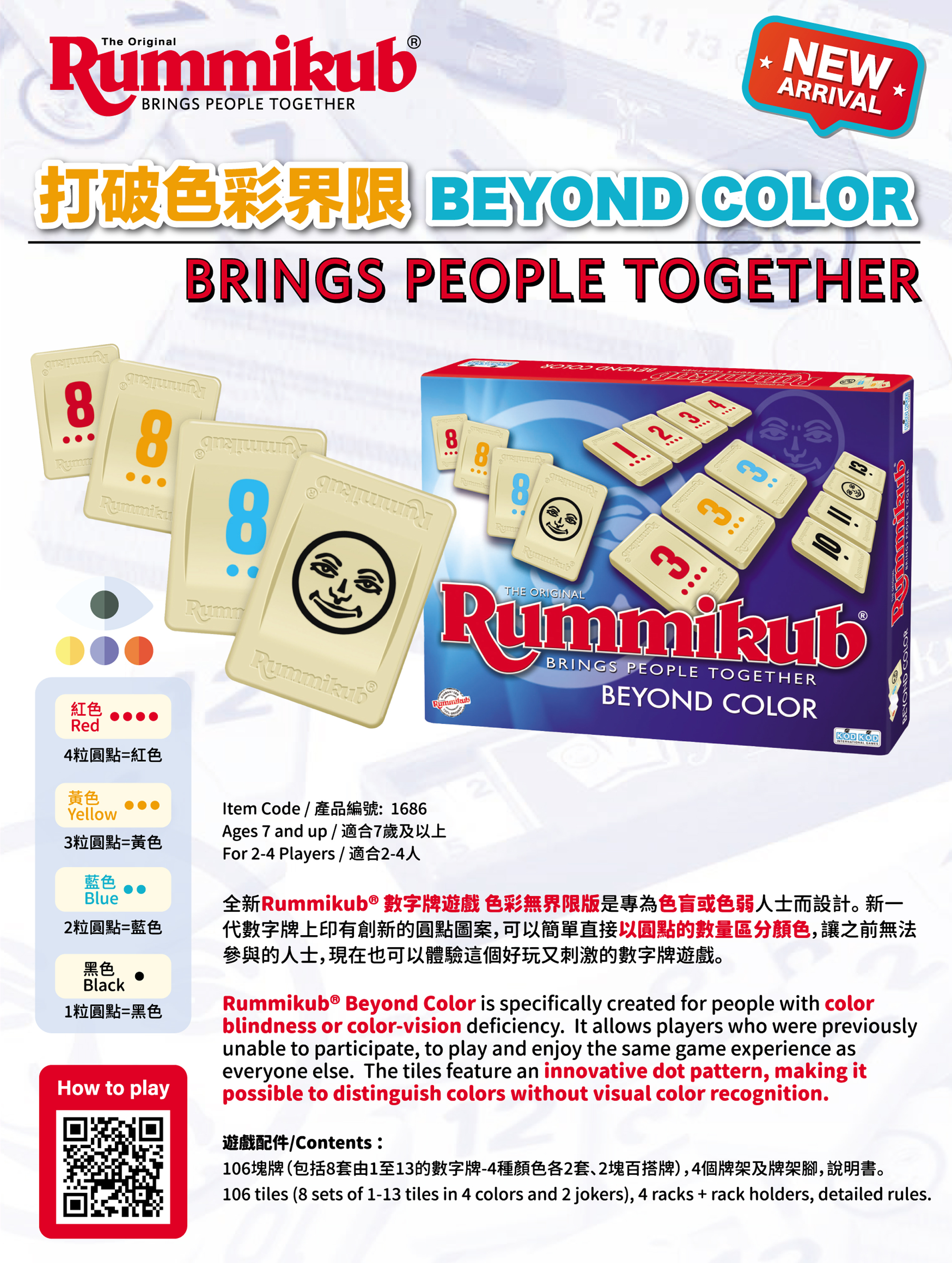 全新Rummikub® 數字牌遊戲 色彩無界限版 是專為色盲或色弱人士而設計。新一代數字牌上印有創新的圓點圖案,可以簡單直接以圓點的數量區分顏色,讓之前無法參與的人士,現在也可以體驗這個好玩又刺激的數字牌遊戲。