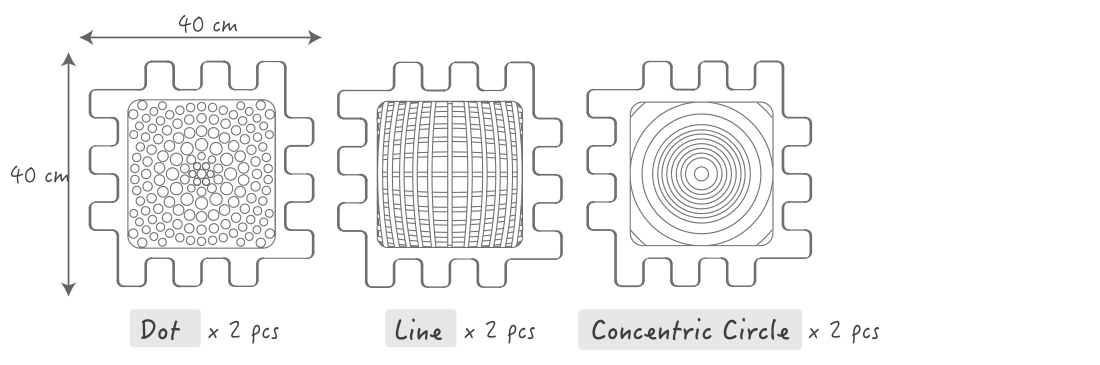 Tactile Cube comes with 6 pieces. Dotted, lined and circular patterns provide tactile stimulation with different levels of intensity. The design encourages children to explore the floor as they begin to crawl. The anti-slip dots at the bottom also ensure the best safety. We-Block Series grows ...