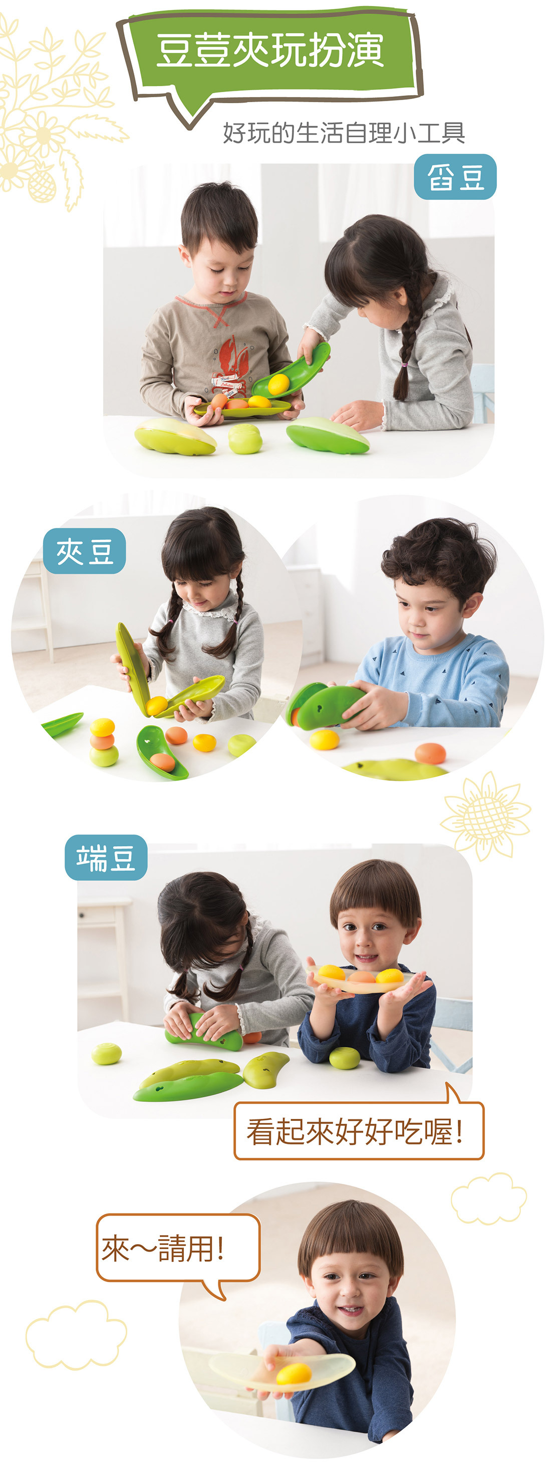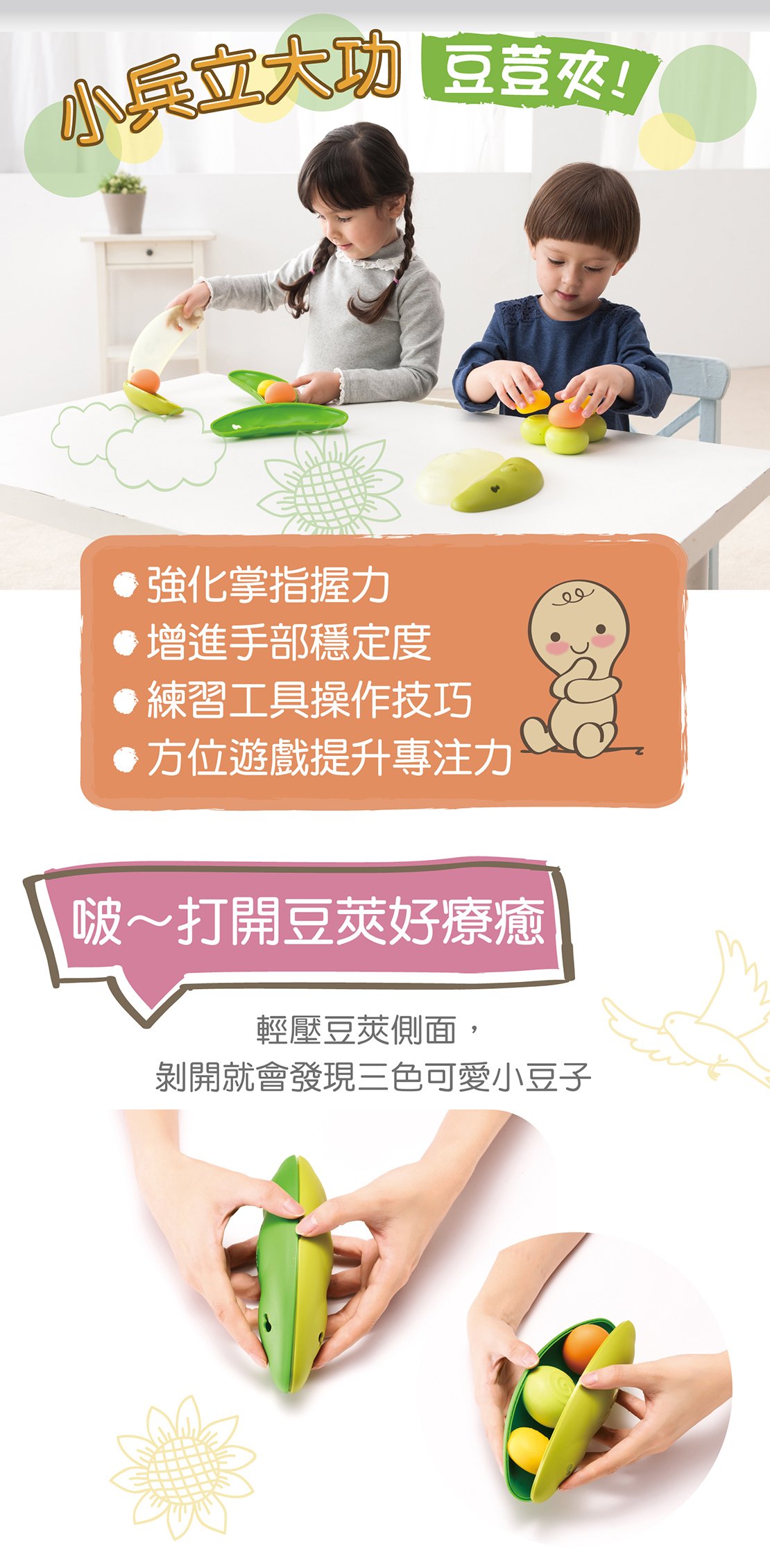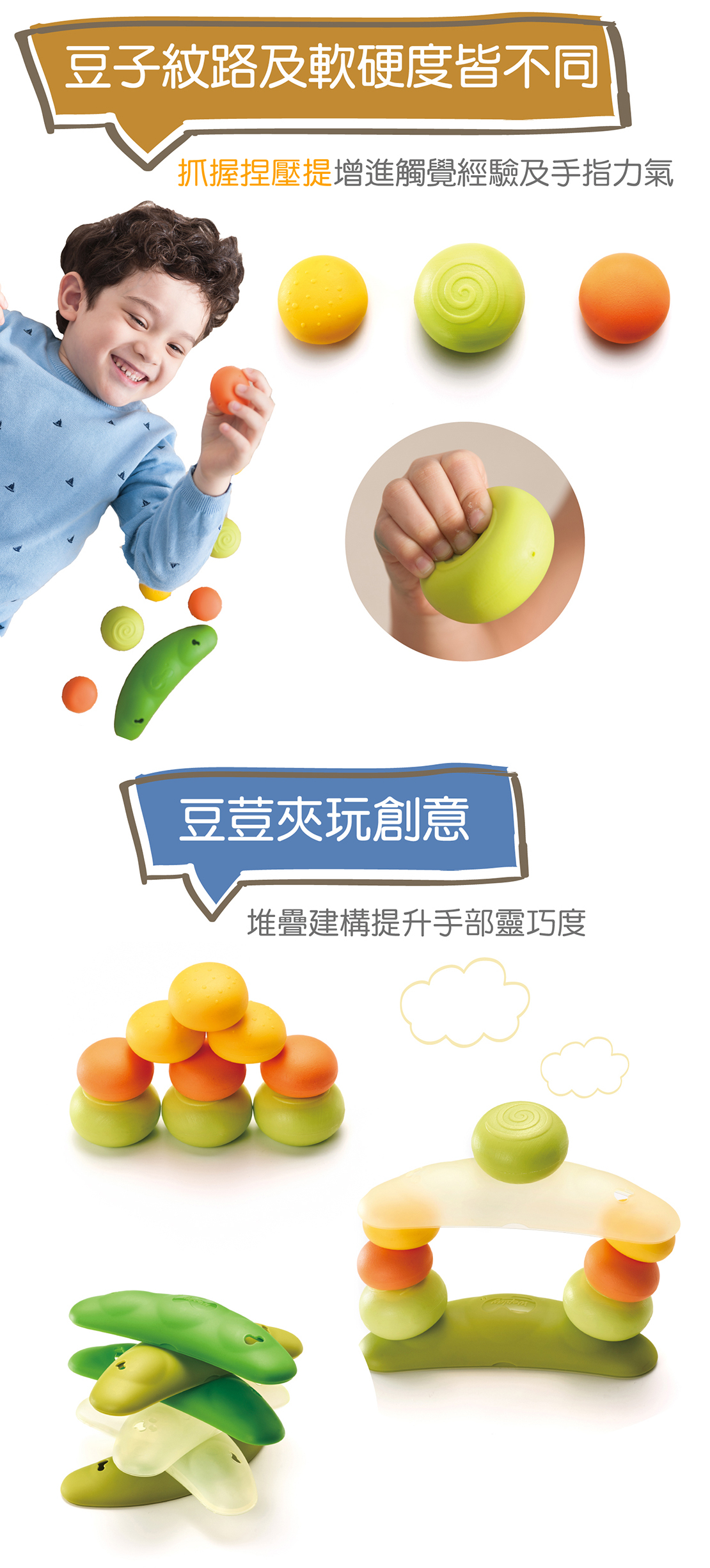 胖胖的豆莢,裡面有三色大小豆的驚喜,觸感及軟硬度也各不同,孩子可使用豆莢進行夾豆、舀豆或堆疊的遊戲,促進手指握力與穩定度,培養生活自理能力。