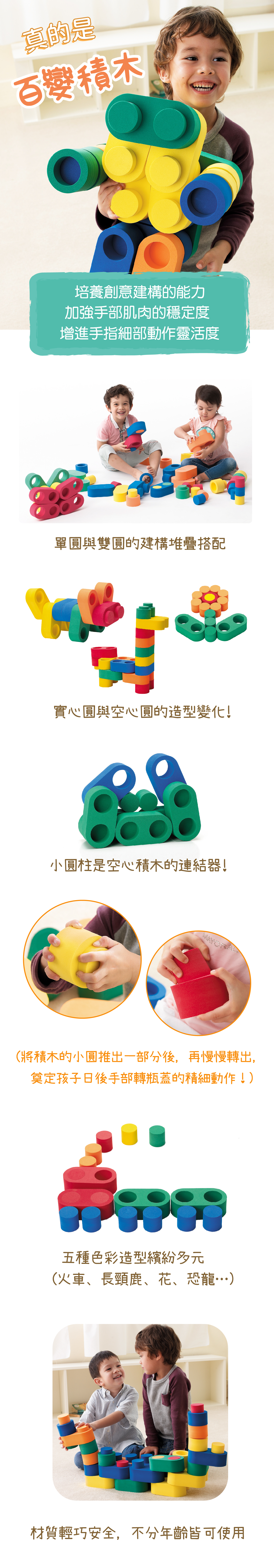 創造無限的功能性積木,無毒無味,強化兒童手腕發展,材質輕巧安靜且無噪音。