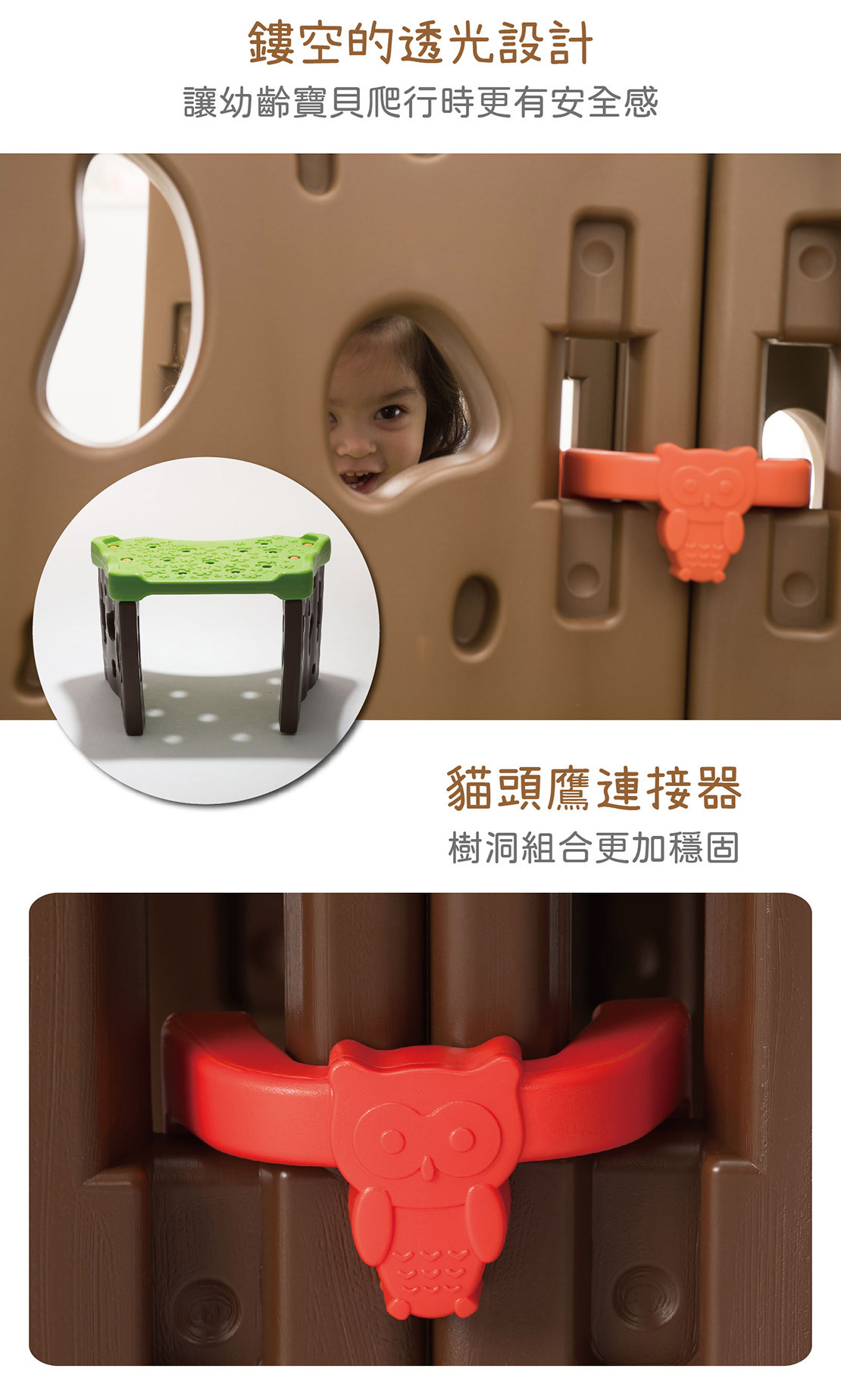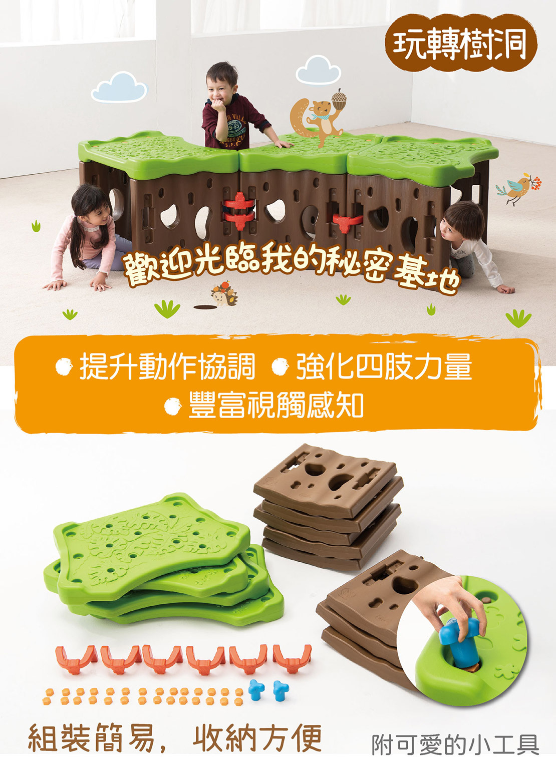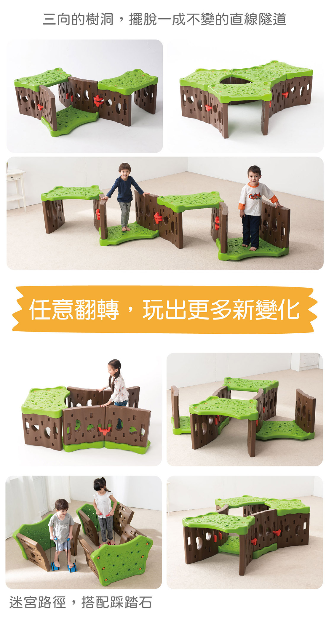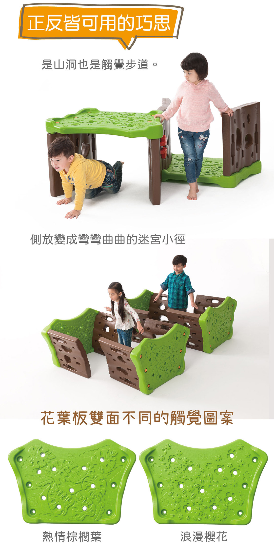一板兩用,可將樹洞屋頂變成觸感十足的步道,一寬一窄的花葉板設計,讓組成的山洞或路徑角度更多元,以ㄇ字型為一個單元,組合越多越豐富,孩子鑽爬或行走其中都樂趣無窮。