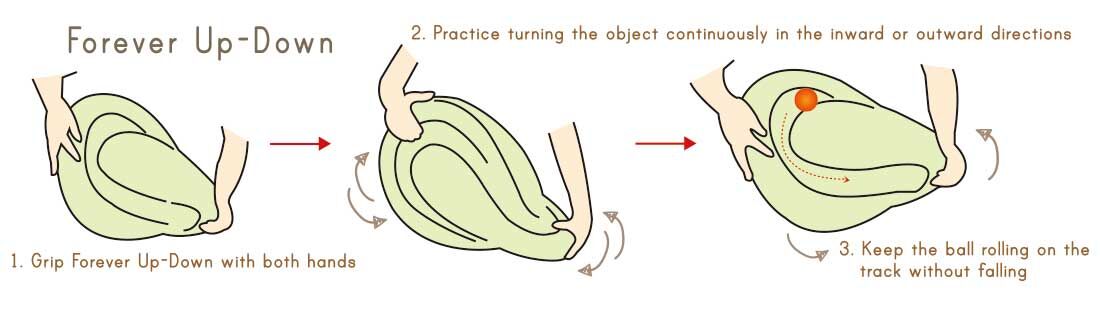 ForeverUp-Down is developed from the concept of the Oriental philosophy of Tai Chi. Itcomes with two balls of different weights and surfaces, which allows forvarying speeds and levels of difficulty. Practicing turning the objectcontinuously inwardly or outwardly improves hand-eye coordination and eyetracking ability.