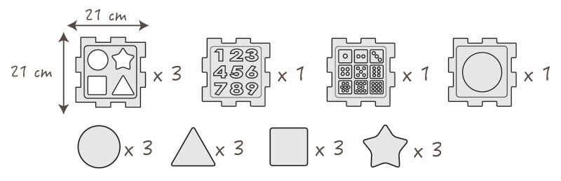 - 4 shapes of blocks (circle, triangle, square and star) for basic shape recognition.