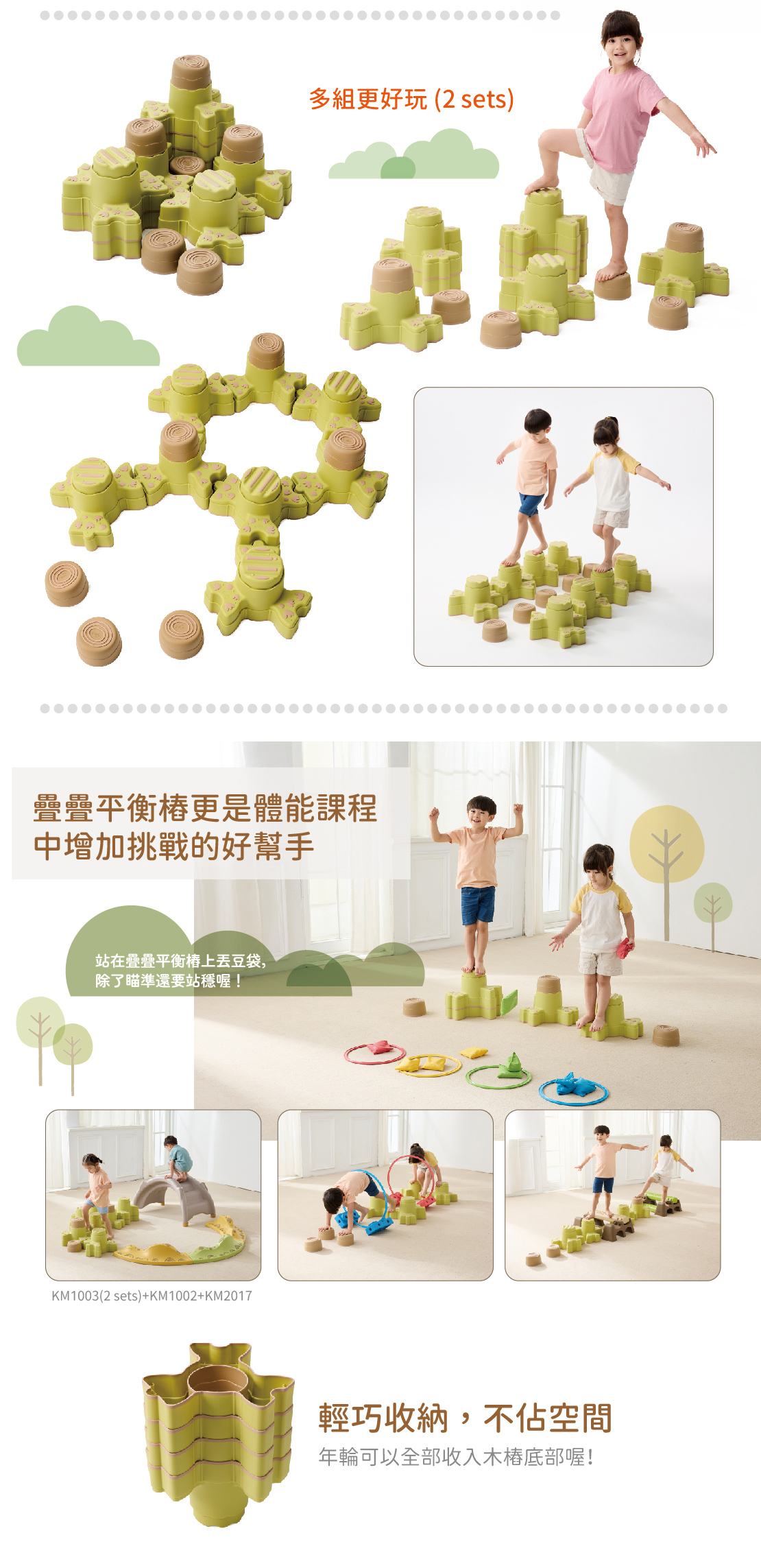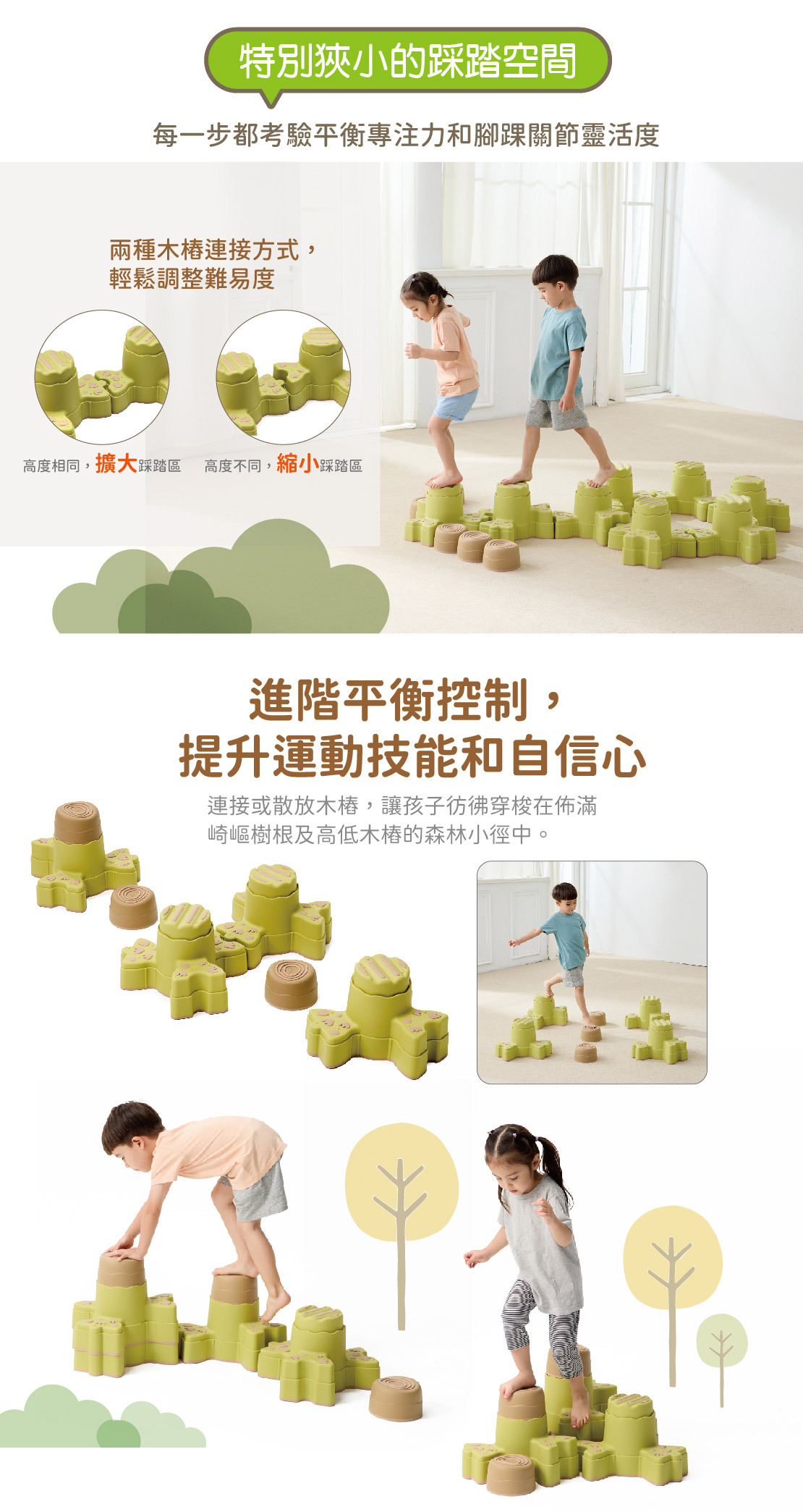 來趟好玩的森林健走之旅!穿越凹凸樹根、高低錯落的木樁和年輪,上下踩踏、大步跨越或小心轉向,時時考驗幼兒專注力,大幅提升下肢力氣和踝關節靈活度。