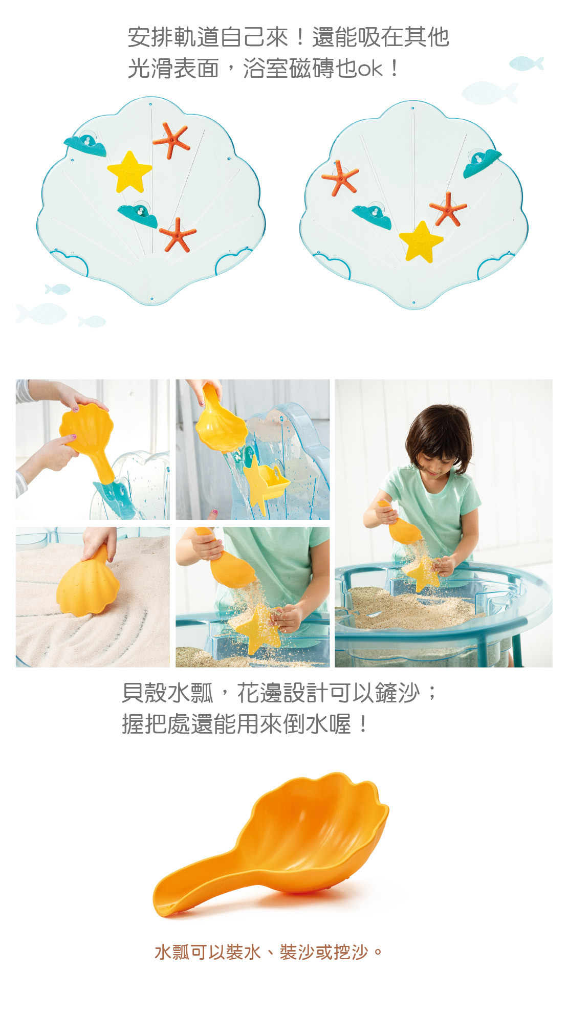 海洋中晶透的貝殼意象,特殊的站立沙蓋設計,吸附可自由安排軌道的戲水配件,跳脫平面而單調的玩沙戲水空間,滿足孩子感官探索、手部操作及培育科學和美感的涵養。
