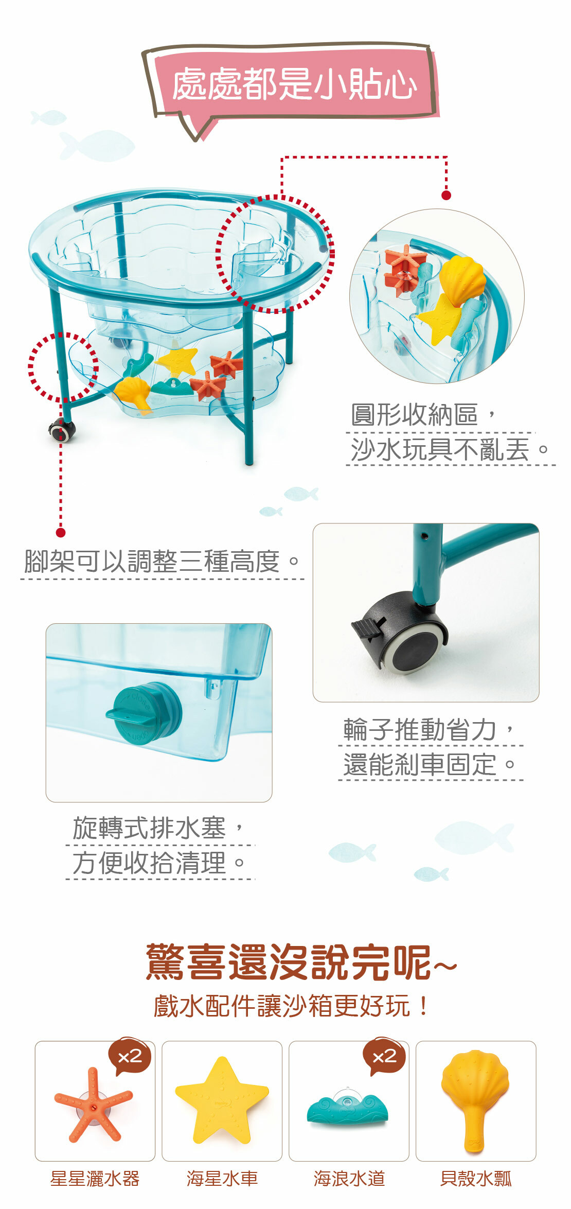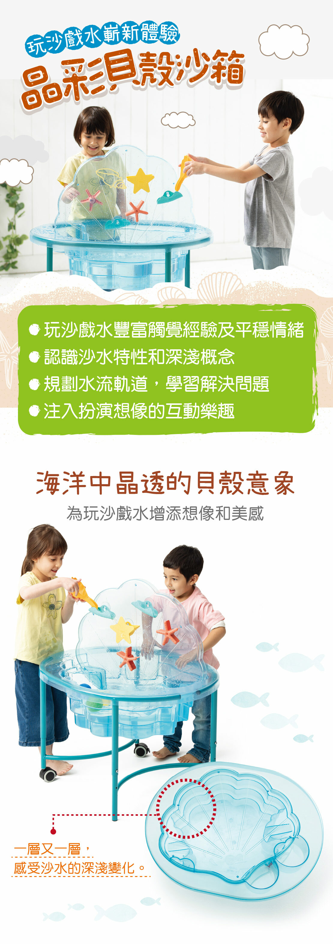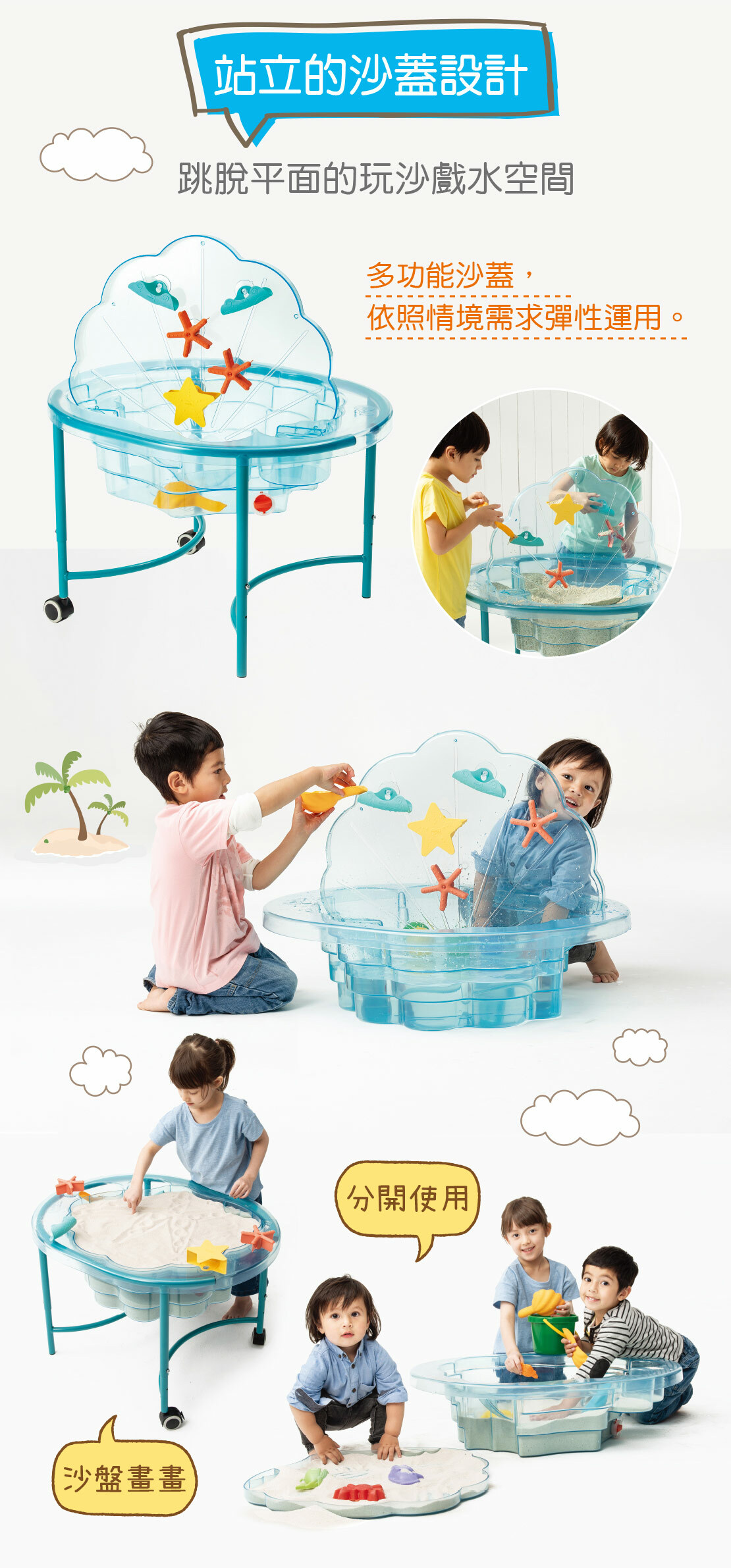This ocean theme sand and water table with specially designed lid and the accessories bring sand and water play to a new level. It is a perfect platform for children to explore the natural properties of sand and water, building problem-solving skills, and unleash their creativity.