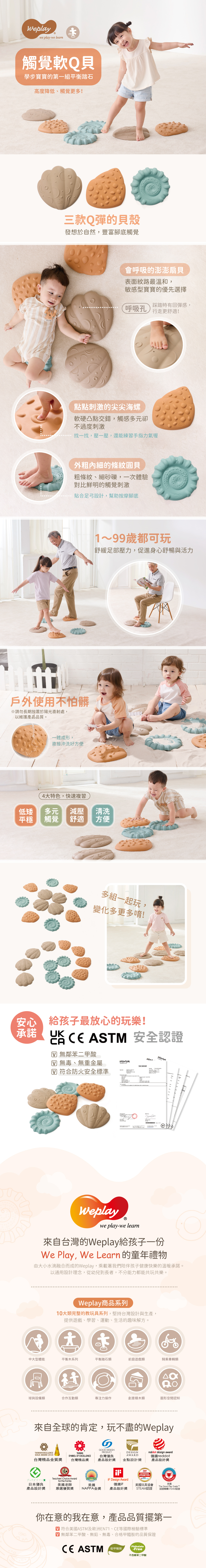 三款軟Q的貝殼,適合幼兒學步或成人踩踏紓壓。每款皆有獨特的觸覺及外觀設計,提供多變的足底刺激,不僅能提升行走平衡能力,還能緩解足部壓力,帶來安心又放鬆的遊戲體驗。