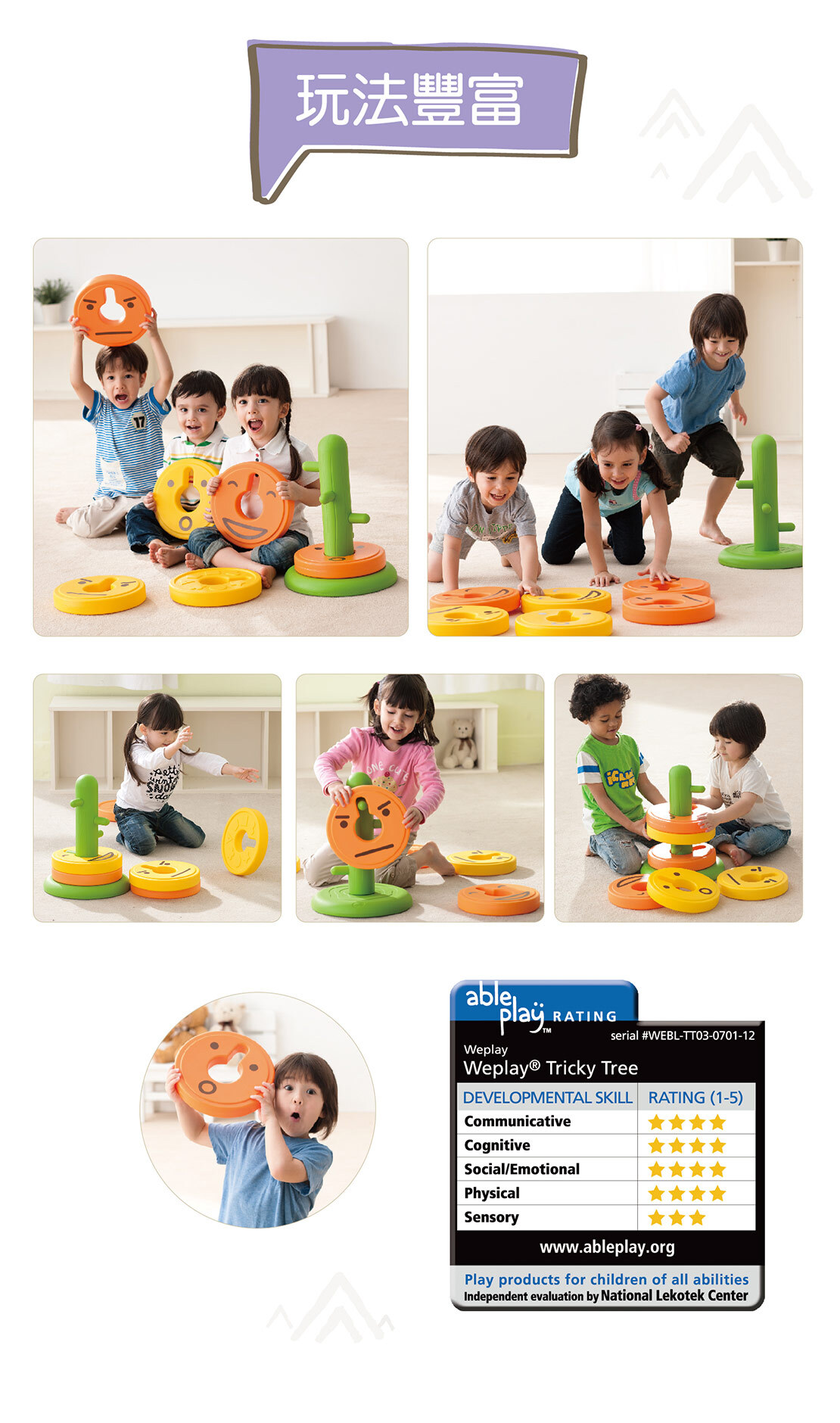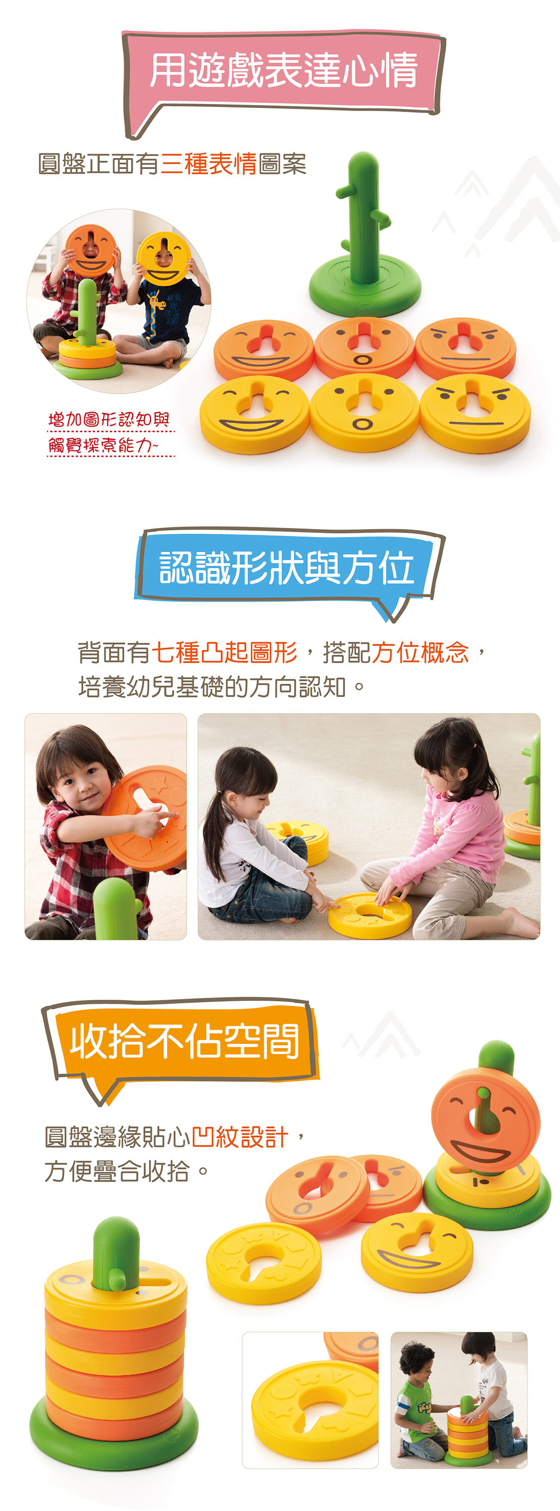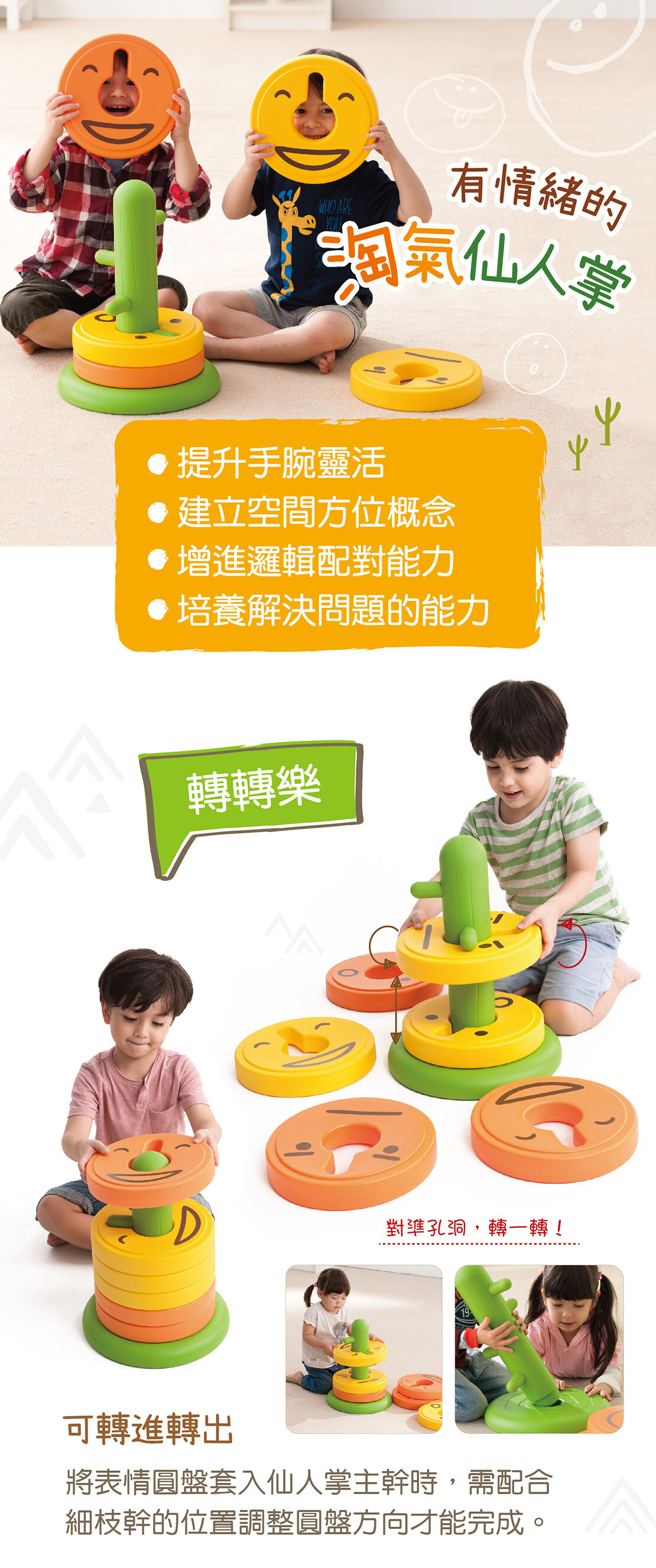 三種表情圓盤,套入或取出仙人掌主幹時,挑戰解決問題的能力﹔鼓勵孩子由坐到站進行遊戲,促進全身運動機會。