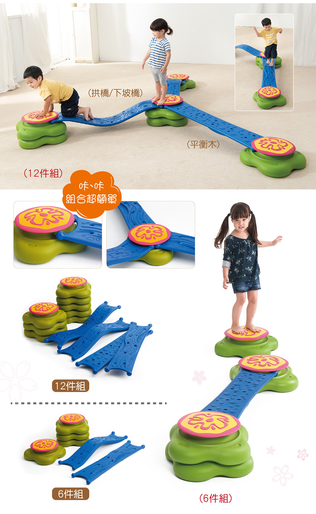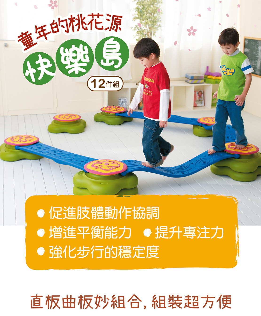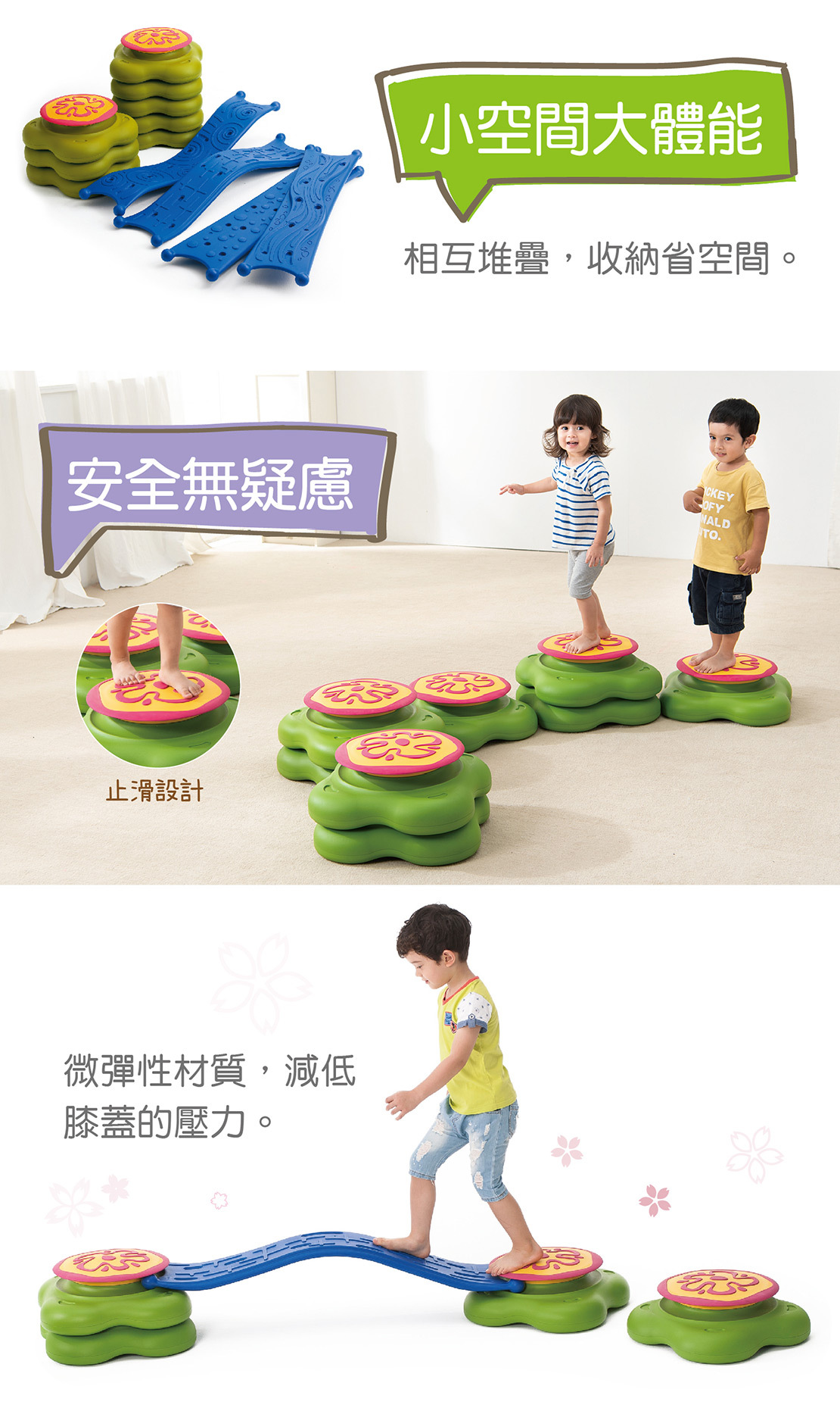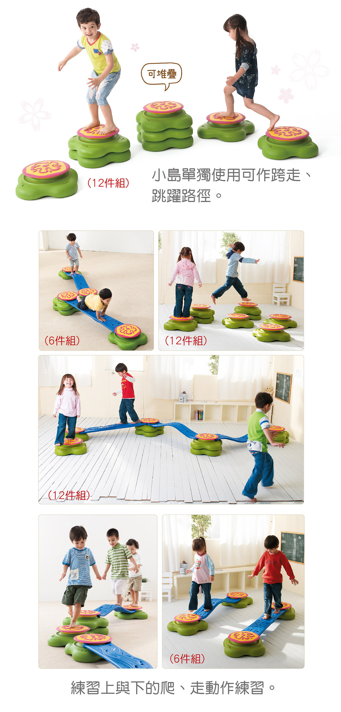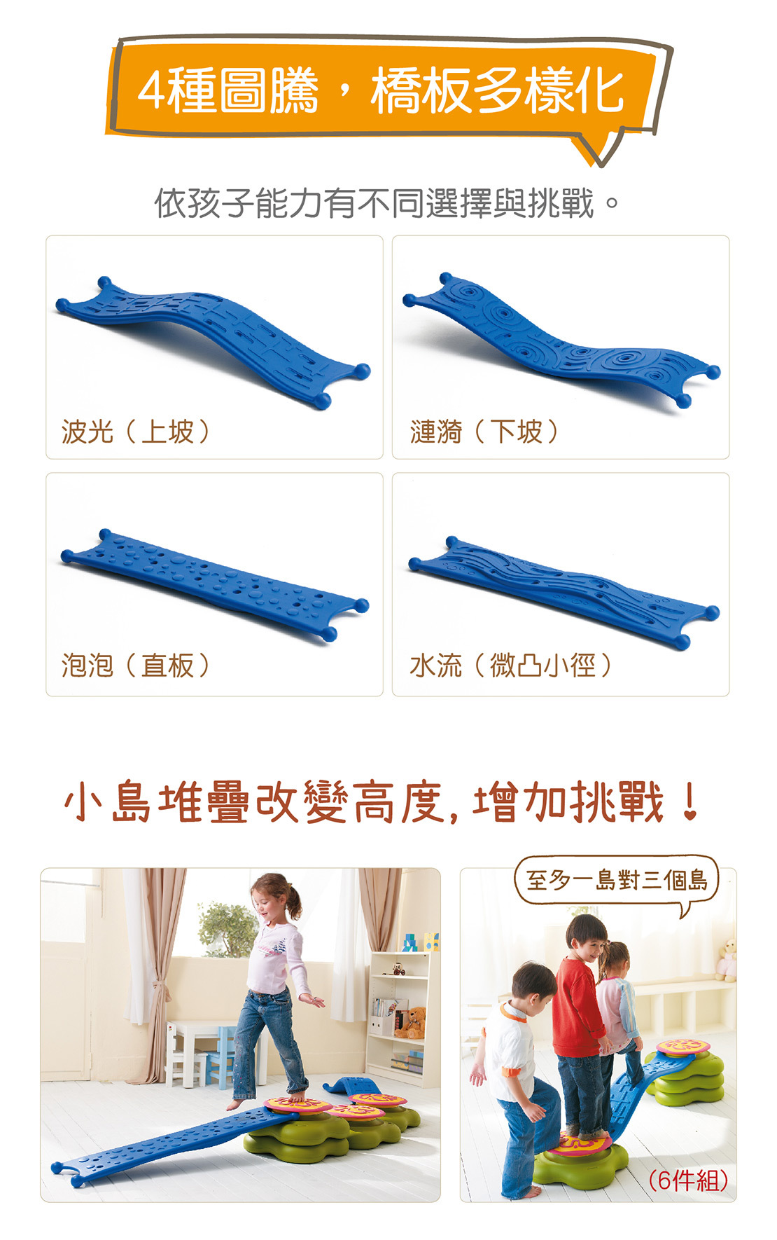 以島和橋組合串連的快樂園地,室內外皆可使用,幫助孩童動作發展、肢體平衡與情緒穩定等。