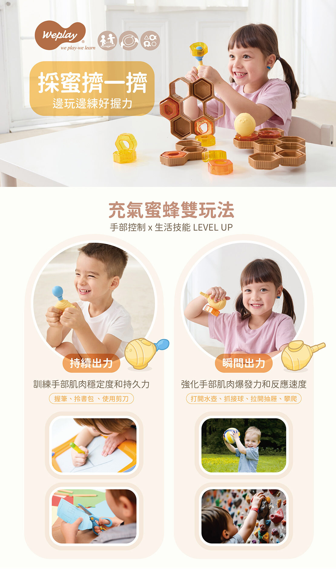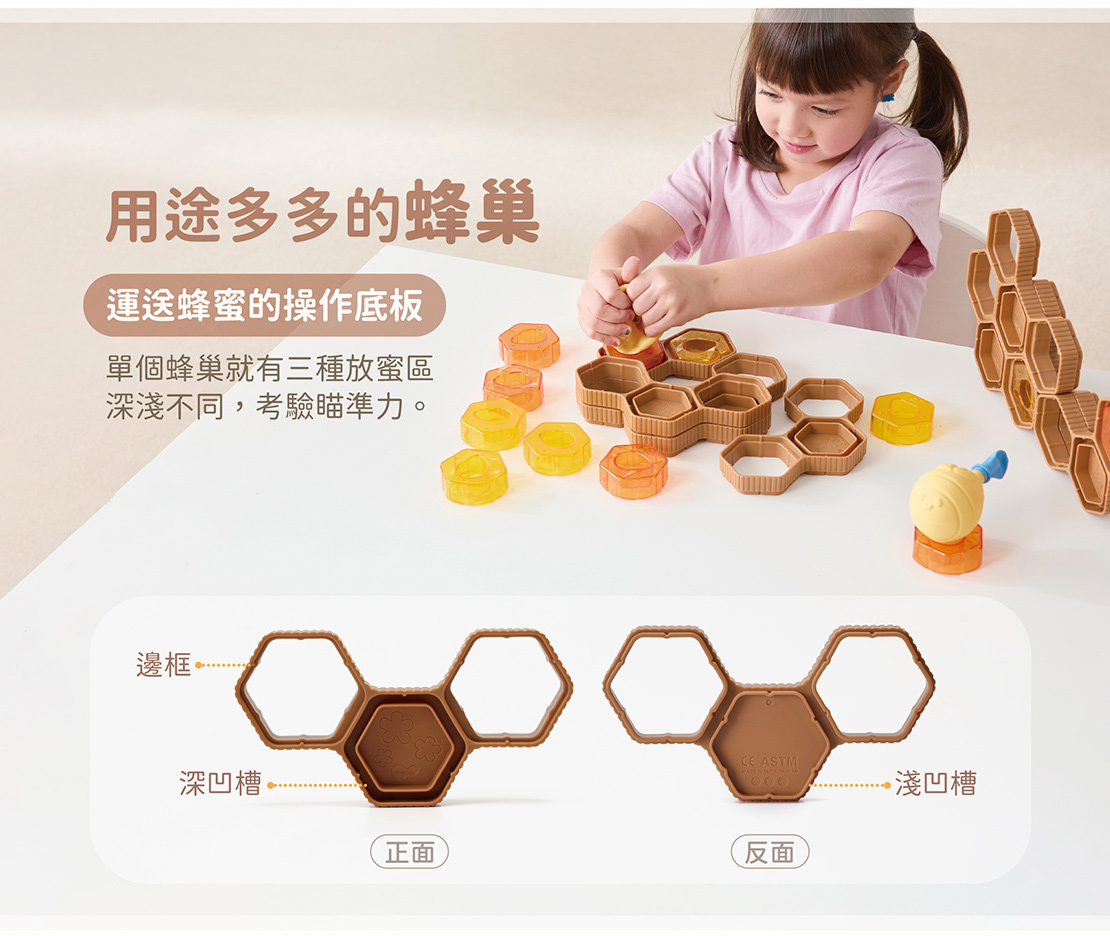 擠壓可愛的充氣蜜蜂,控制氣球的充氣程度,快快將採集的蜂蜜運回蜂巢吧!使用者還能扮演蜂巢建築師,創造出各種平面或立體的蜂窩,從中提升手部握力、空間感及專注力;附雙面遊戲圖卡,提供造型範例、認知配對和互動桌遊等多元玩法。