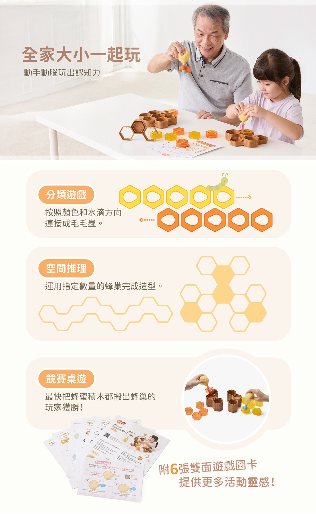 商品組件:充氣蜜蜂2隻、蜂巢8個、蜂蜜積木12個、氣球30入個、雙面圖卡6張。